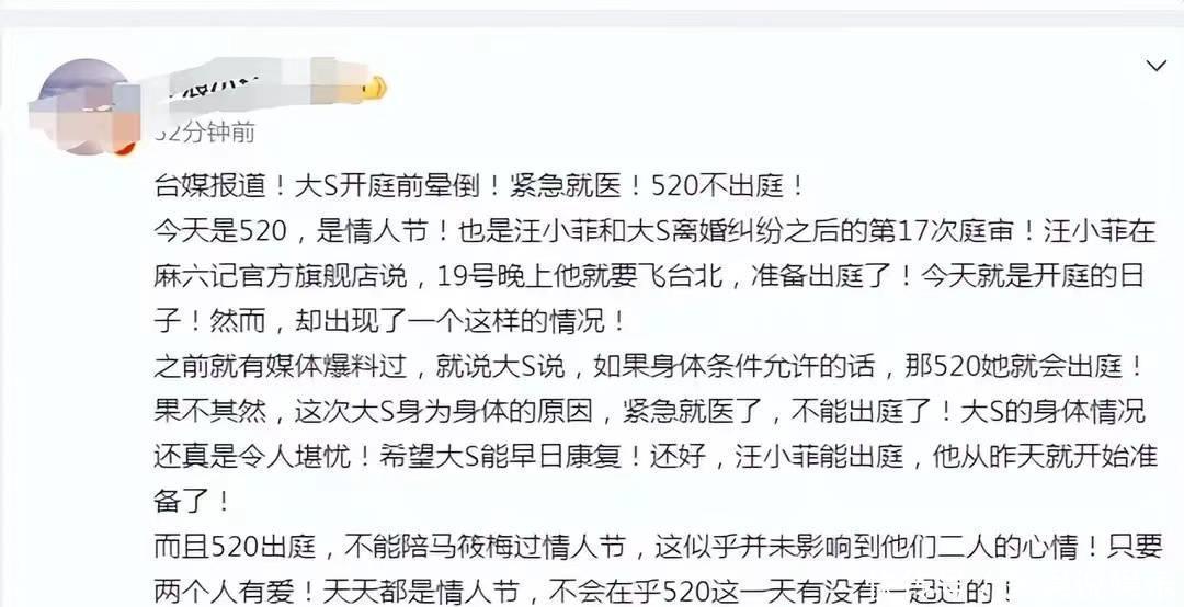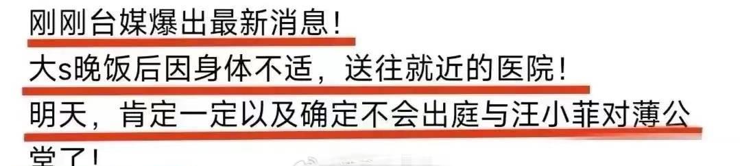 大抵是知说念我方这回又要白折腾,大S徐熙媛昨天对外声称我方我晕入院了,没目的去法庭和汪小菲三头对案。