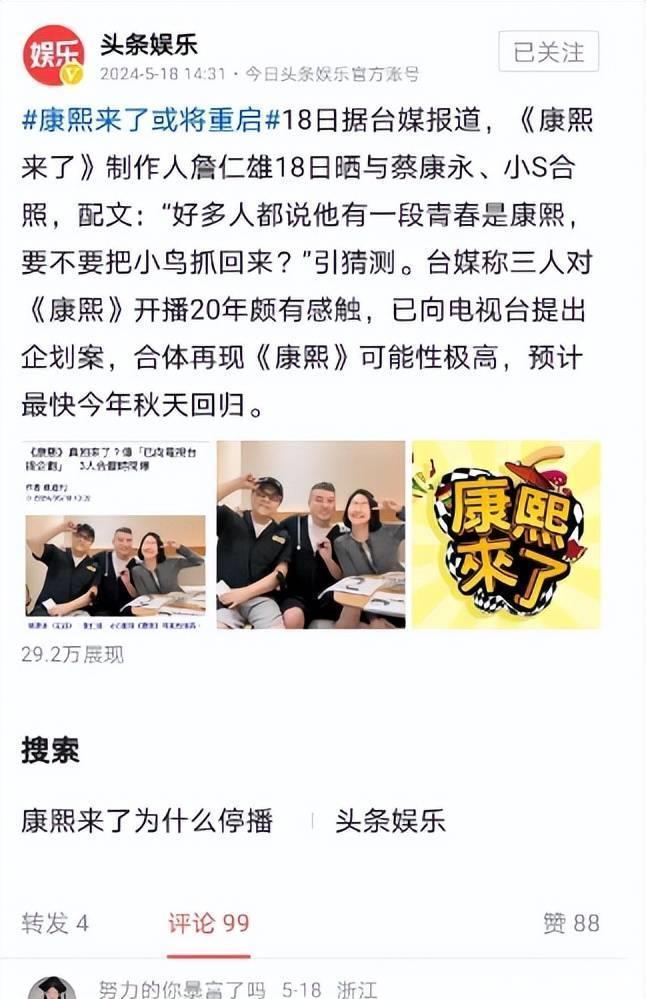 题:大S开庭前我晕,汪小菲迎来管事飞腾期,康熙来了或将重启!